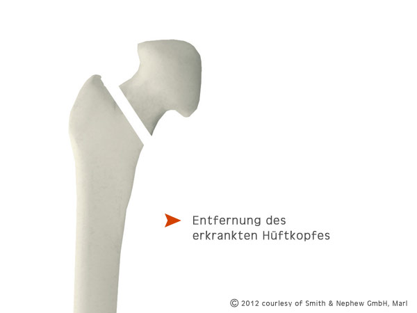 Wirklich wichtig für Sie ist, dass der Arzt die optimale Prothese für Ihre Bedürfnisse ausgewählt hat. Dank seiner langen Erfahrung wird er Ihre Gelenkgeometrie so natürlich wie möglich wieder herstellen. Das Gelenk liegt unter verschiedenen Muskelschichten und ist von der sehr festen Gelenkkapsel umgeben, die vorsichtig geöffnet wird. Jetzt hat der Arzt freien Zugang zum Gelenk. Der verschlissene Oberschenkelkopf wird entfernt und der Knochen für das speziell ausgewählte Schaftimplantat vorbereitet.