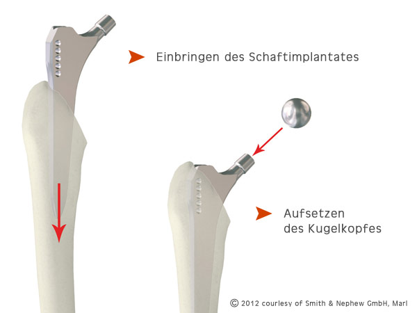 Anschließend wird der Metall- oder Keramikkopf auf den Schaft gesteckt und in die Gelenkpfanne hineingesetzt.Der Arzt testet anschließend die Beweglichkeit des Beines und überprüft nochmals die gesamte Gelenkgeometrie und die Gelenkspannung. Danach werden die Gewebeschichten wieder vernäht und die Wunde geschlossen.